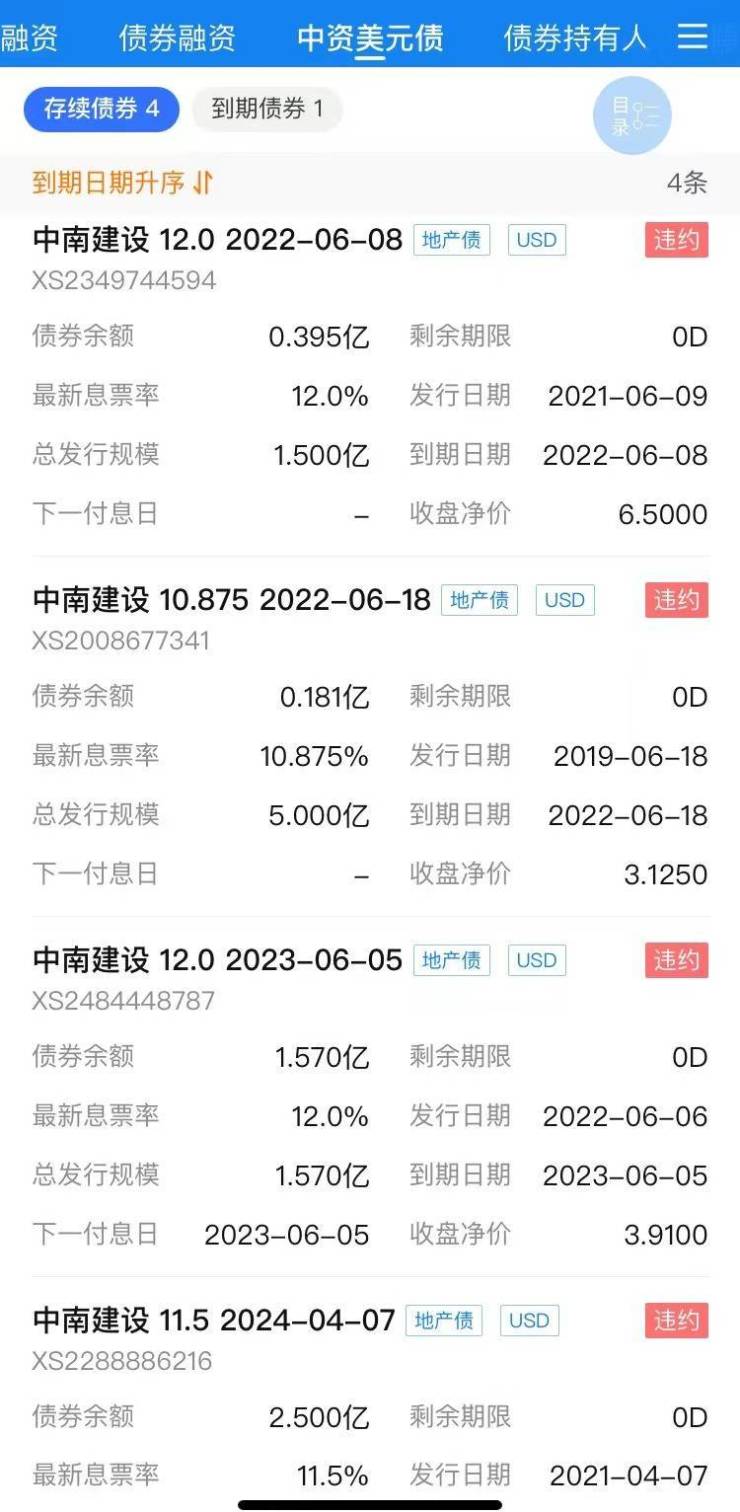 同期,中南建设还有4只存续美元债,余额4.646亿美元,显示为“违约”状态。
