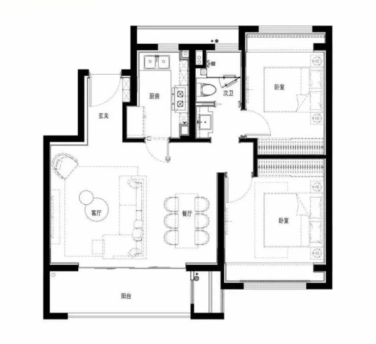 建面约83㎡的洋房户型,迎合了目前市场的主流,做到5.8米大面宽横厅,客餐厅一体化的设计,连接宽景大阳台。同时一南一北两间卧室,均带有飘窗,采光进一步延伸。干湿分离设计,更加科学高效。