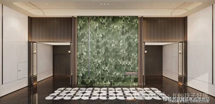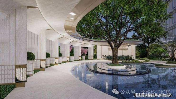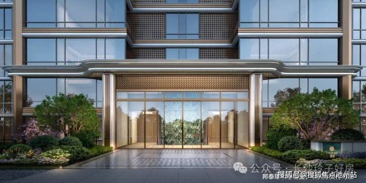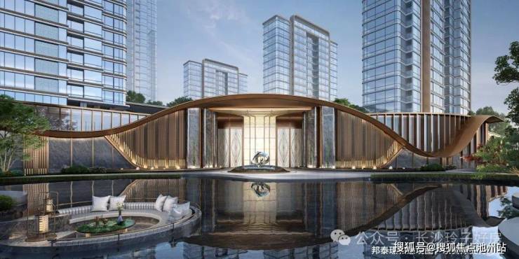 售楼部前场打造度假式前场园林(后期移交市政),大量水景搭配丰富绿植,约82米长、约12m高,环岛式落客,星级酒店般的体验,臻奢用材,运用多种奢石,打造封面级城市界面