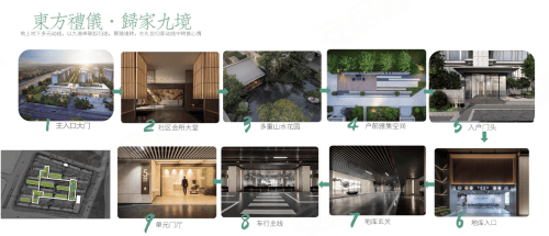 九重归家动线:社区入口双层酒店式形象门楼——(地上归家)社区会所大堂、多重山水花园、楼前雅集空间、单元大堂 ——(地下归家)地库出入口、地库玄关、车行主线、地下层单元大堂
