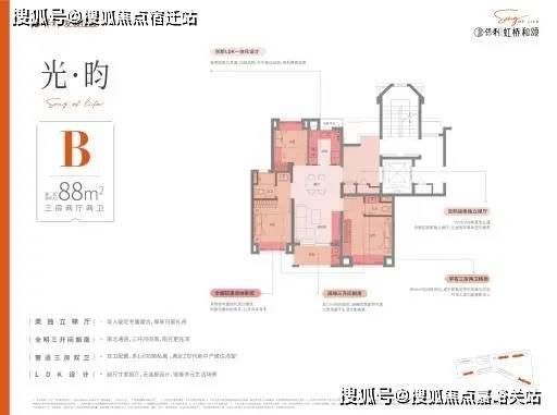 相较于市面上普遍的建面约88㎡只能做3房1卫的设计,该户型竟做到惊人的3房2卫!