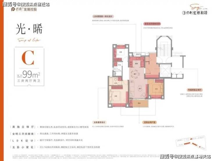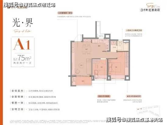 户型设计上,保利虹桥和颂,品质改善为出发点,设计“私属、至臻、尊崇”三大产品理念,臻奢建面约75㎡户型,三开间朝南,阳光与清风为伴,玄关+餐边柜+飘窗,全能收纳,卫浴三分离,干湿有别,奢阔餐客厅一体,空间明朗,动线流畅。