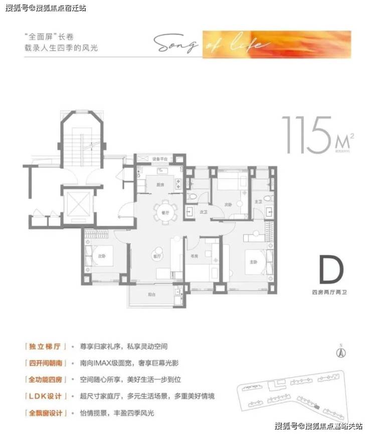 建面约115㎡4房2卫户型做到了同面积段罕见的四开间朝南+四房设计,南向IMAX级景观面,卧室阳光满溢,功能性也拉满。功能性十足的同时也不失舒适性,主卧南向大面宽+贯穿南北。