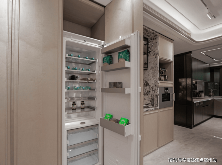 来到客厅,收纳空间更是拉满。 次净衣区、餐边柜全部是交付标准 ,大面积 影木 的使用,加上装饰主义细节,质感出众: