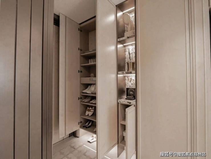 以137㎡户型为例,进门右手边是一门到顶的玄关柜收纳,转角之后,还有一个进深约60cm的豪华收纳,可以用来收纳业主的行李箱、童车、平衡车等等。