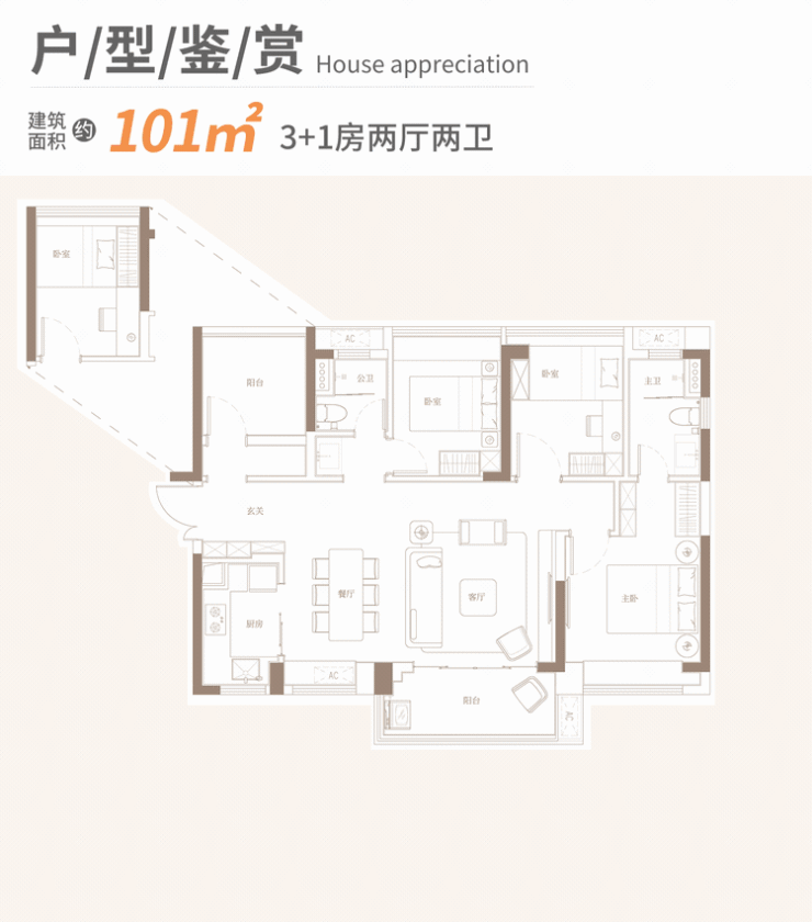 建面约90㎡2+1房,双卫设计,满足二孩或三代同堂生活。