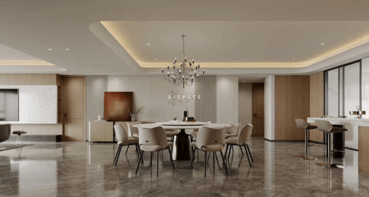 宽敞的大横厅与客厅和餐厅完美融合,形成了一个开放式的空间。优雅的意式装饰元素与精致的家具搭配,相得益彰,营造出令人心驰神往的氛围。