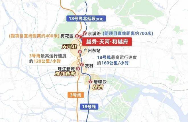 小区的区位不错,正好处在广州的中轴线,与地铁3号线梅花园站约860米,步行约13分钟即可到达,乘坐地铁前往珠江新城仅需经过4个站点,无需换乘,交通十分便捷,正在建设中的18号线北延段京溪路站在旁也在项目附近,未来开通后将进一步方便前往珠城、琶洲等地的出行