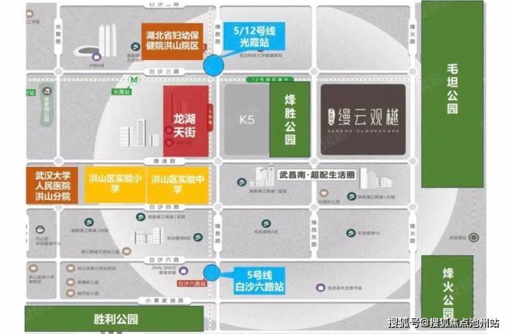 清能锦城缦云观樾项目位于武昌南二环,在洪山区白沙三路与烽火路交汇处(地铁5号线光霞站旁),周边有白沙洲现阶段很成熟的配套,600米内5号线+12号线内双地铁、洪山实验小学+中学双学区、武大人民医院+省妇幼双三甲、西侧烽胜公园+东侧毛坦公园双公园;