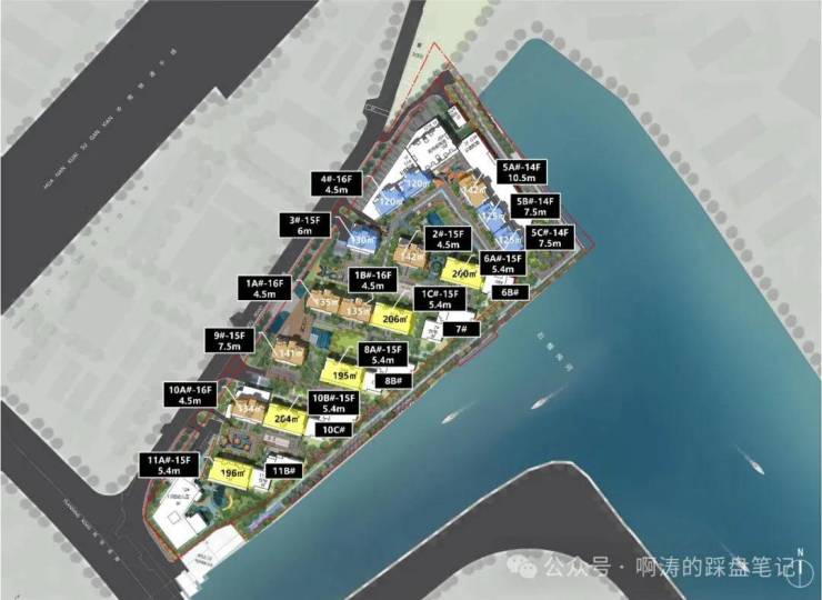 户型排布从石榴岗河自东向西依次升高,保证了约300米宽的生态水景面。