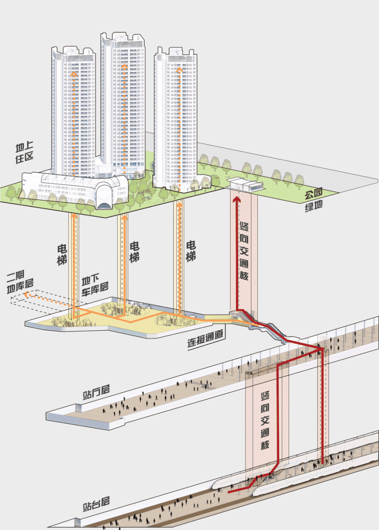 项目与其他TOD项目最大的区别在于:规划了市面上地铁盘所少有的专属归家通道,与地铁站厅无缝衔接;业主通过专属通道抵达地铁站,享受无日晒无风雨出行体验。