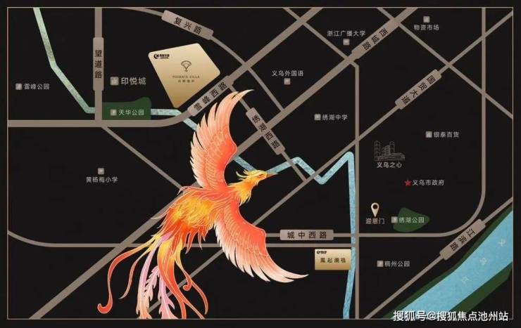 同时,绿城·义乌凤栖逸庐与绿城·义乌凤起潮鸣在区位上也相互呼应对仗,由古老的迎恩门为中心,与市政府间划出无形直线为轴,两者如凤凰般两翼拍动,中间古老城南河和城西河连通贯穿,形成“一水两园”的唯美格局。