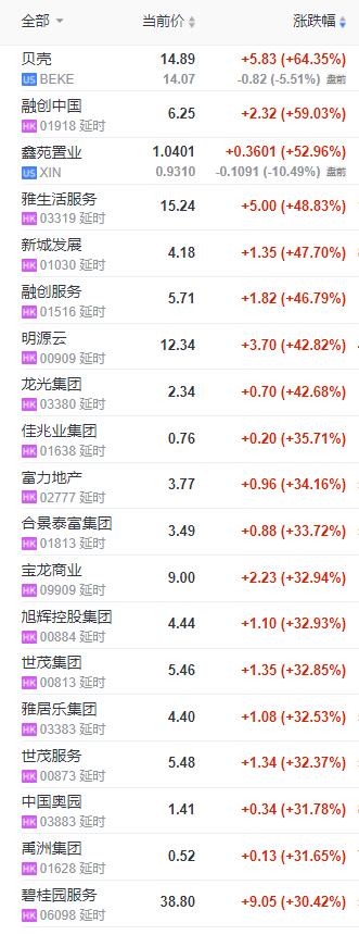 A股阳光城和大龙地产涨停,新城控股、宋都股份、金科股份和京投发展等房企涨超8%。地产股暴红,物业股也全面跟随。