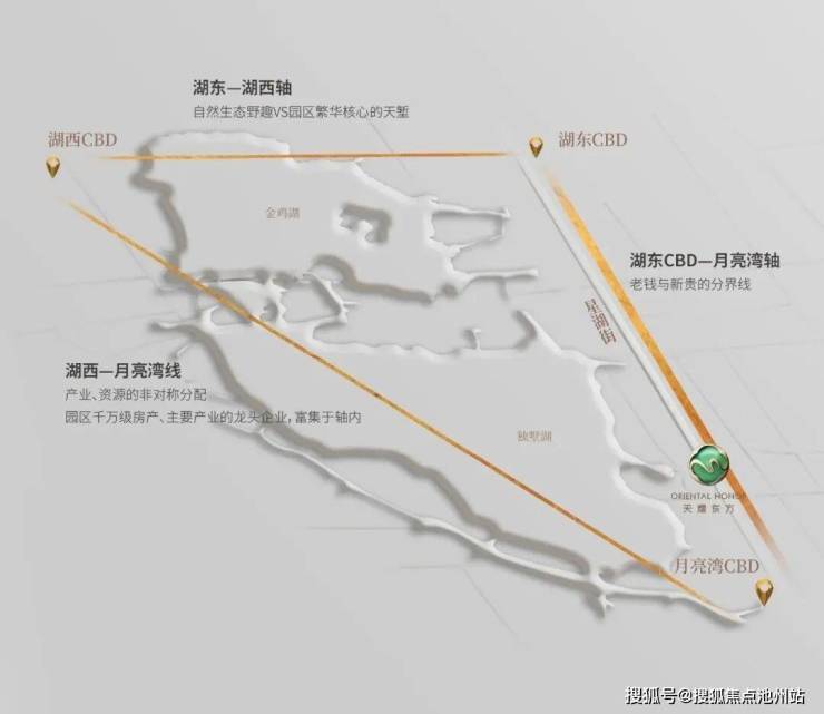 约6公里的东西向轴线上,驻扎着银行、保险、外资总部和星罗棋布的生态公园,轴线以内,从苏州中心到玲珑湾再到中海湖滨一号,象征着园区品质生活典范区。