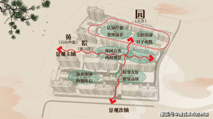 一环: 健康跑道;两轴: 主入口景观轴、次入口景观轴;五景:休闲会客-西窗观景,康养休闲-修髓练心,睦邻友好-群贤品谈,认知疗愈-花溪漫步,全龄活动-百子欢腾。