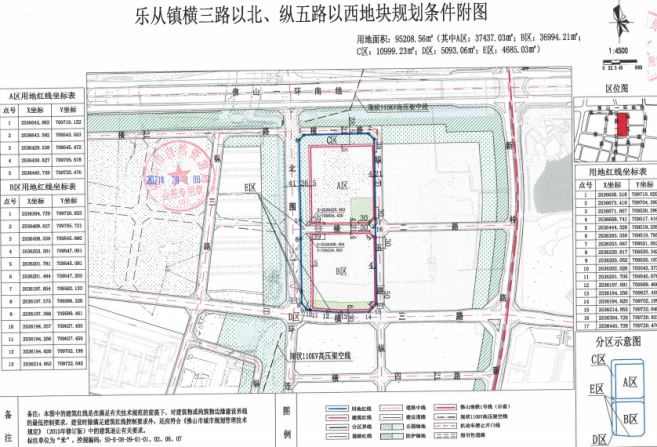 公告显示,项目总占地95208.56㎡,容积率不高于2.2,绿地率不低于30%,分为A/B/C/D/E五区进行开发。A/B区为城镇住宅用地兼容零售商业用地;C/D区为公园与绿地;E区为城市道路用地。项目须1年内动工,4年内竣工。
