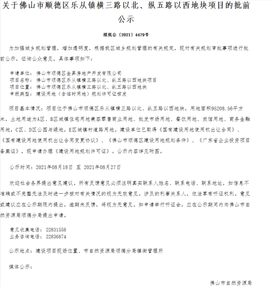 近日,佛山市自然资源局顺德分局发布了《关于佛山市顺德区乐从镇横三路以北、纵五路以西地块项目的批前公示》,公示了金地乐从项目的相关情况。