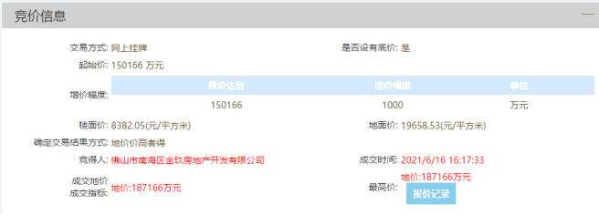 据悉,该项目于2021年6月16日由金地以总价187166万元夺得,折合成交楼面价8382.05元/㎡。