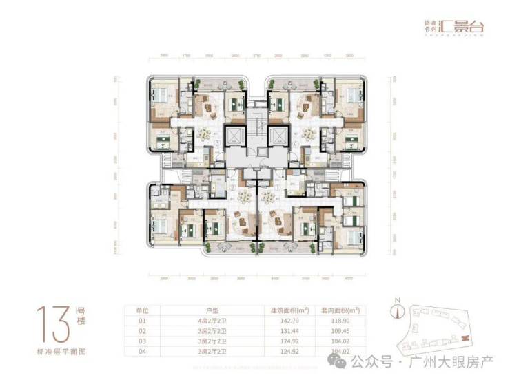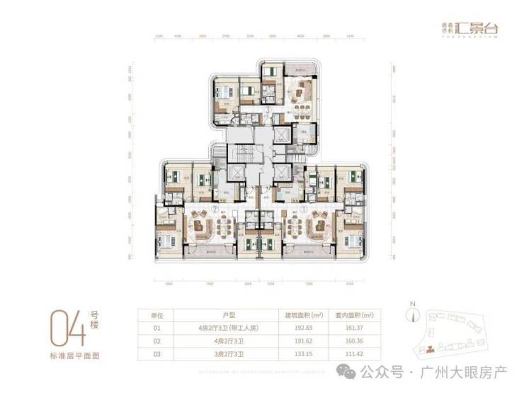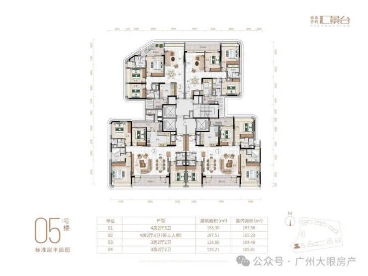 项目由14栋12层小高层组成,产品涵盖123-352㎡三至五房,共8类户型,户型实用率约82-84%