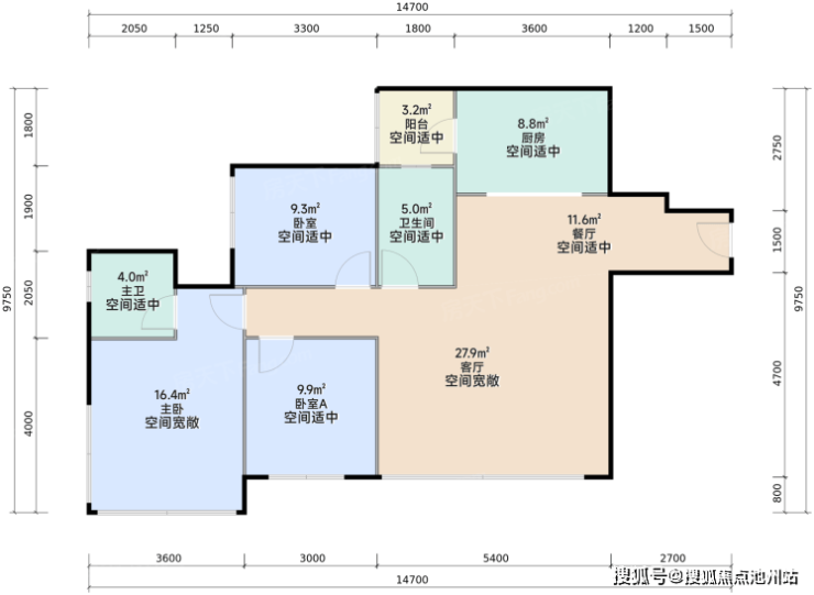 建面约 88㎡户型:三房双卫设计,总价相对较低,为购房者提供了低总价入住观音桥核心区域的机会。