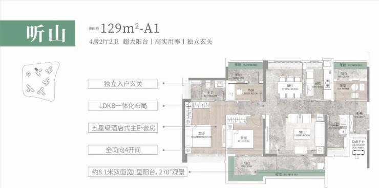 建面约129㎡听山户型,阳光玄关设计,兼容了户内的私密性,储物空间又是全明采光,也符合广东地区对风水的理解,舒适性和实用性都考虑到。