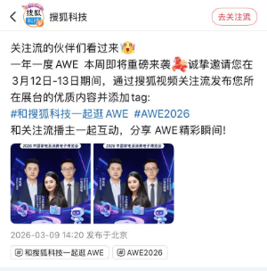 此外,搜狐科技邀请众多关注流伙伴在AWE期间以#和搜狐科技一起逛AWE #AWE2026 话题词,共同发布新鲜有趣的AWE动态,一起创造繁荣社区生态、多视角展示AWE的丰富内容。