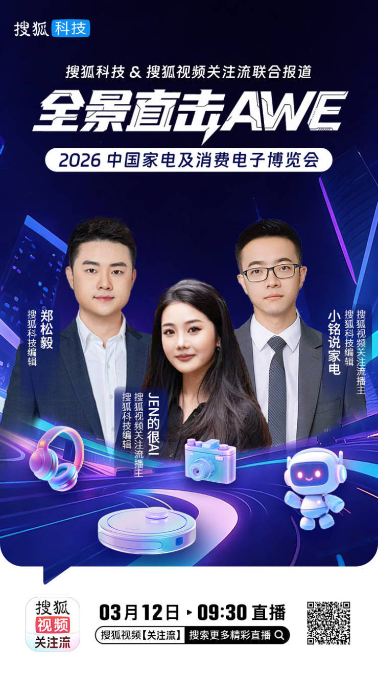 在内容形式上,AWE报道团将继续在搜狐视频关注流带来AWE直播活动。3月9日,天风证券家电行业首席分析师周嘉乐在搜狐视频关注流与搜狐科技编辑连麦直播,分享AWE2026及家电行业前沿趋势。
