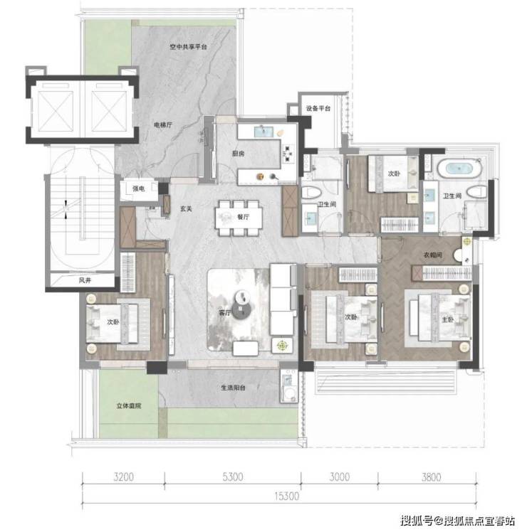 把空中平台+立体庭院+宽境阳台,悉数搬到平层,打造一个「空中花园大宅」。
