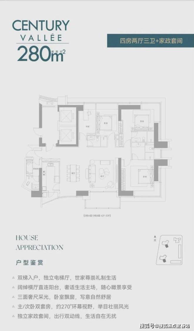 建面约233/280/386㎡传世大宅,Y字型建筑结构,均享受270度三面采光视野,目之所及皆风景,约3.5米朗阔层高;尊享8梯3户,双专梯入户,私家电梯厅;配备独立家政套间,出行双动线,生活自在无忧;由杜康生大师参与统筹精装用材用料、品牌、选款、风格,甄选MASTER、嘉格纳、唯宝、大金等全球顶级精装品牌(或同档次品牌,以实际交付为准)。