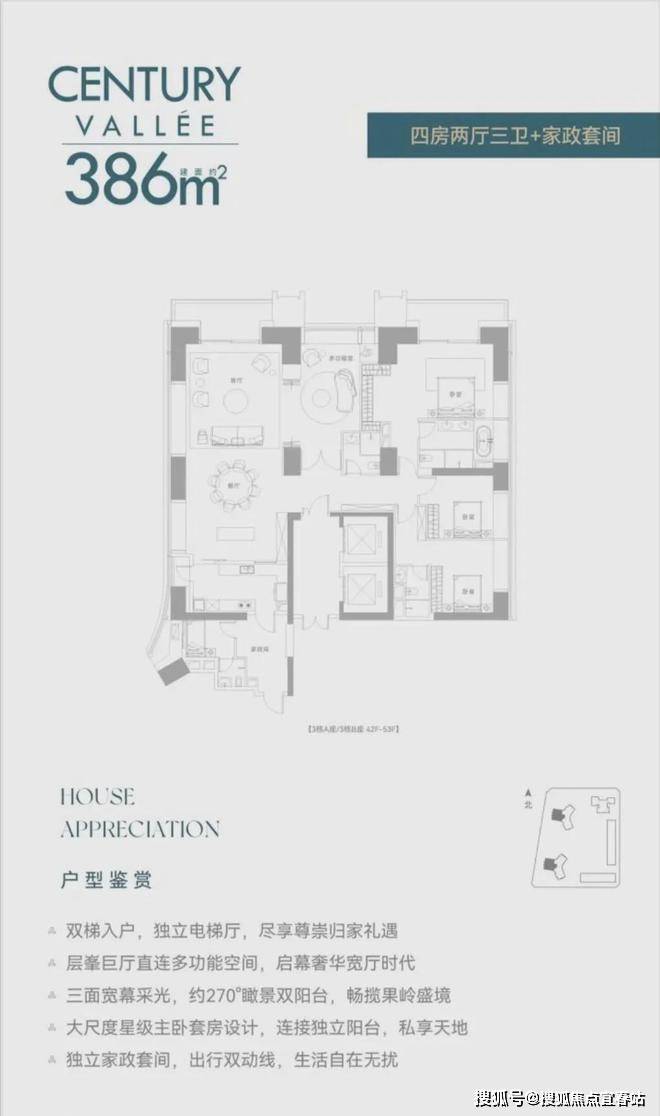 【约386㎡4房3卫】双梯入户,独立电梯厅,阔绰横厅直连多功能空间,三面舒适采光,主次卧双套房,270°环幕视野,还有独立家政套间,西朝向看名商高尔夫和大河沙生态长廊。