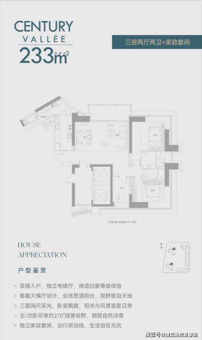 【约233㎡3房2卫】双梯入户,独立电梯厅,餐客大横厅贯通阳台,三面采光,主次卧尽享270°环幕视野,还有独立家政套间,西北朝向看名商和沙河高尔夫;