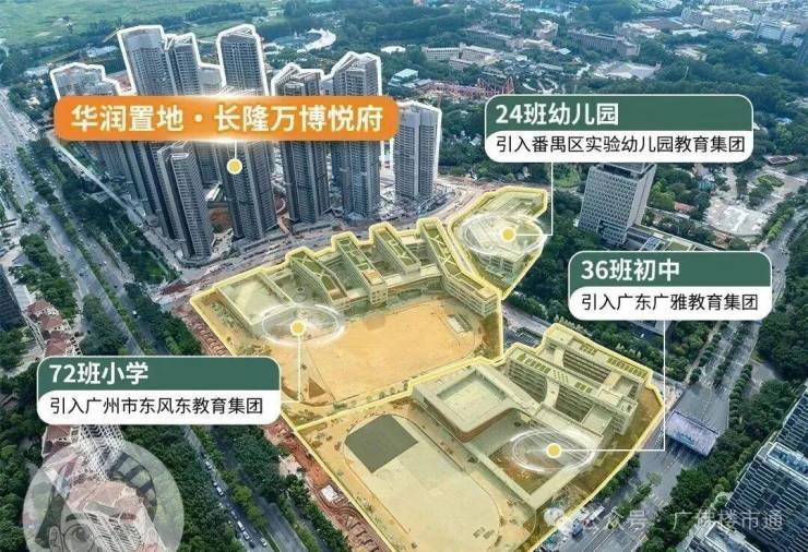 住宅地块主要分为两期开发,目前一二期均在售,另外还包含了两块商业用地,其中一块配建万象商业,和中小学用地(配建21班幼儿园+72班小学+36班中学),是目前广州在售项目中,为数不多集学铁商的项目之一。
