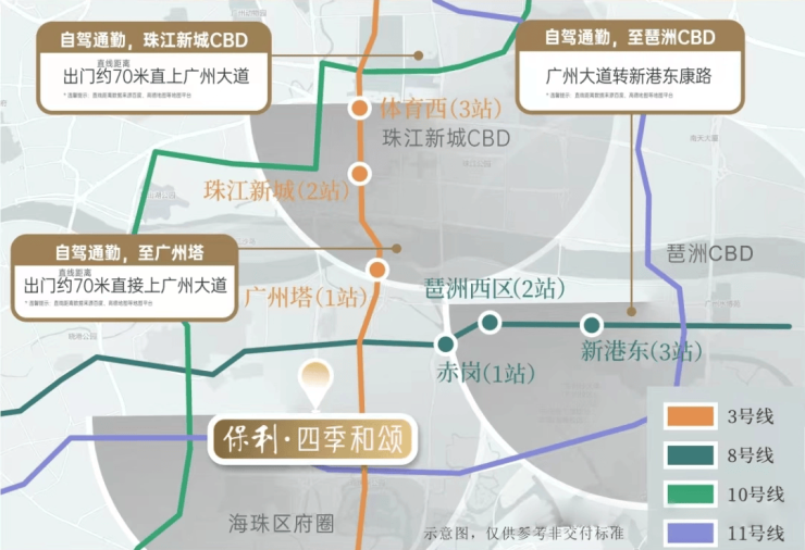 周边有3/8/10/11号线,4条地铁交汇,这四条地铁线两两垂直交叉,把小区围在一个长方形内,可接驳 3 号线与 8 号线交汇客村站、8 号线鹭江站及在建的广州环线 11 号线逸景路站,可实现 1站广州塔2 站珠江新城琶洲西区,3 站体育西,4 站昌岗商圈
