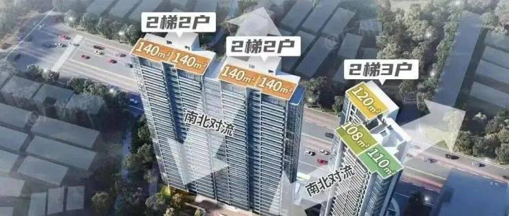 2号楼为两梯三户,分别有三种户型,108/110方做三房,120可做四房。3栋(3A/3B)则是140方可做四房户型,板楼设计,两梯两户,是楼盘的主打户型,货量最多。