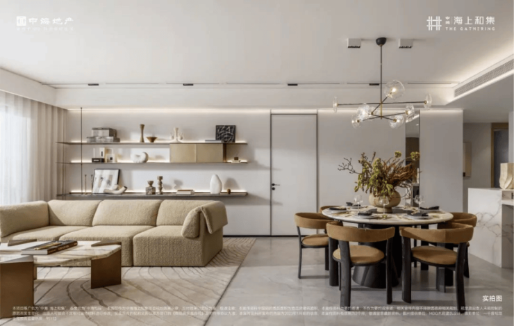 近50㎡的超大客餐厅,可以轻松容纳下岛台、中式大圆桌、沙发、电器墙等生活场景,承载阅读思考、美食分享、聚会休闲、音乐趣味等多种生活功能。