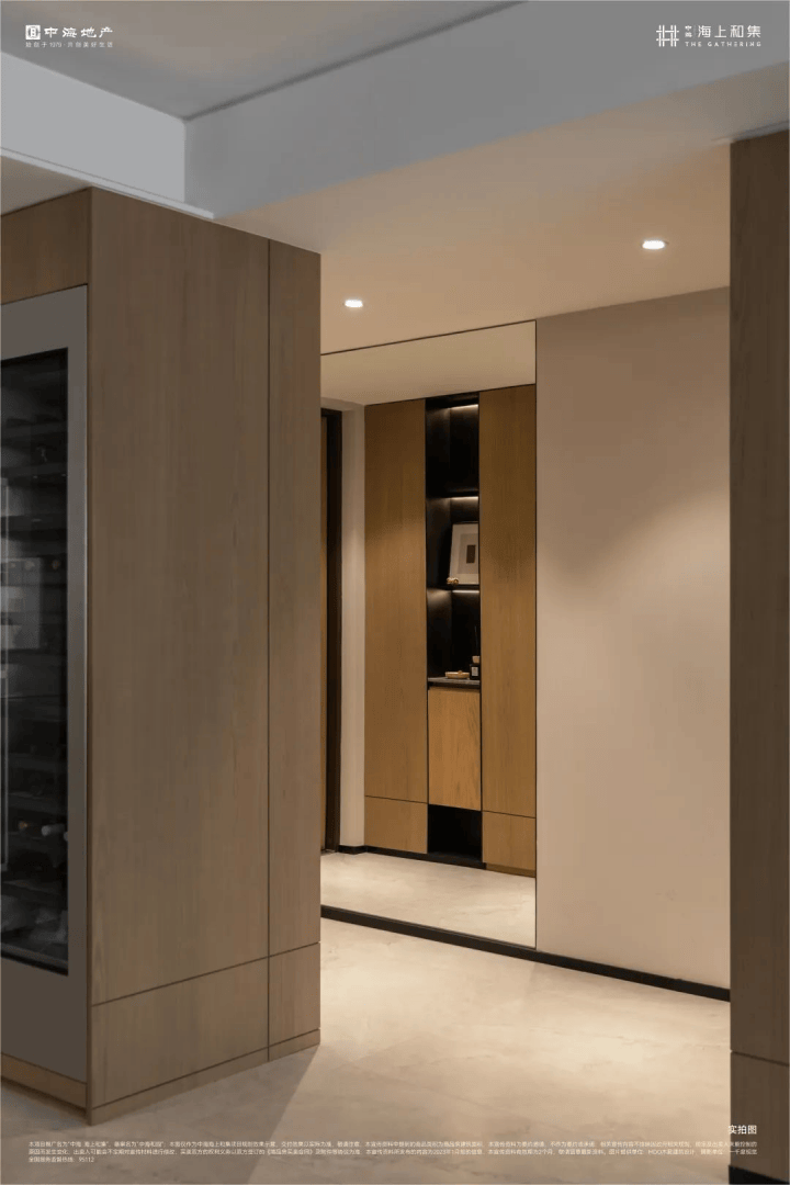 约4m长的玄关过道,并预留有紫外线灭菌装置及插座点位。一整面的镜面墙体,让整个空间显得更开阔。