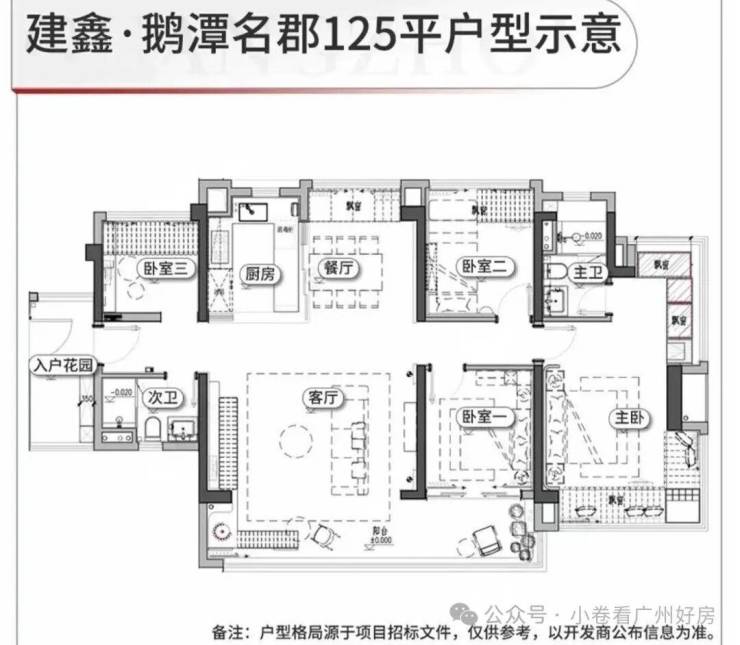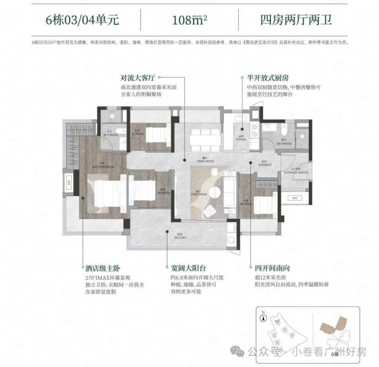 106㎡三房:6.5米阳台+入户花园,使用率超110%。按新规设计,实际使用面积比同面积旧规户型多10㎡左右。