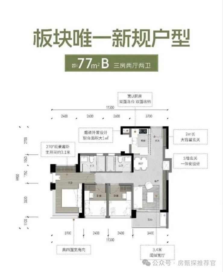 推出建面约77-135㎡三四房新规户型,万科檐屿城使用率最高可达约138%,并通过270°全景舱主卧、四面宽朝南约7米阳台等设计,将生活充分向自然打开,让LDKB一体化客厅和可变空间