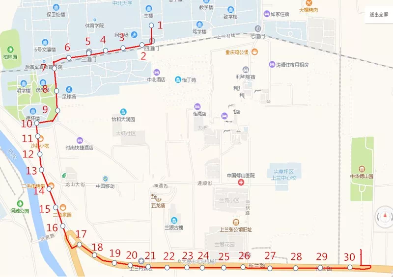 综改区孵化基地诚信广场→富士康园区南门→进富士康园区内直行出北门→太原重工