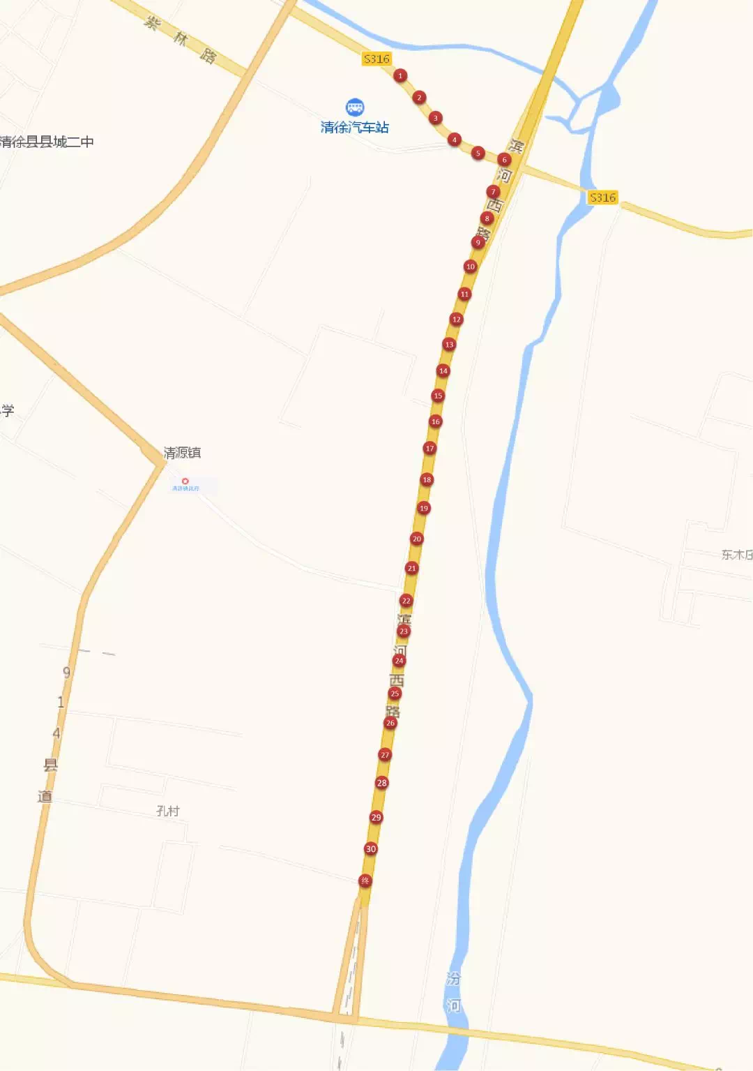 208 国道常庄口附近→清东路→太原幼儿师范学校→省警校→徐沟中学→徐沟镇政府