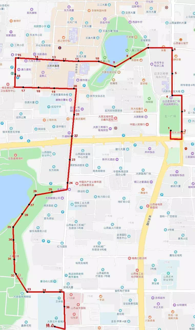 小店区委区政府大楼→昌盛西街往西→小店区一中→汾东路口掉头往东→小店区教育局→过人民路口往东→汾东文体中心→和谐公园