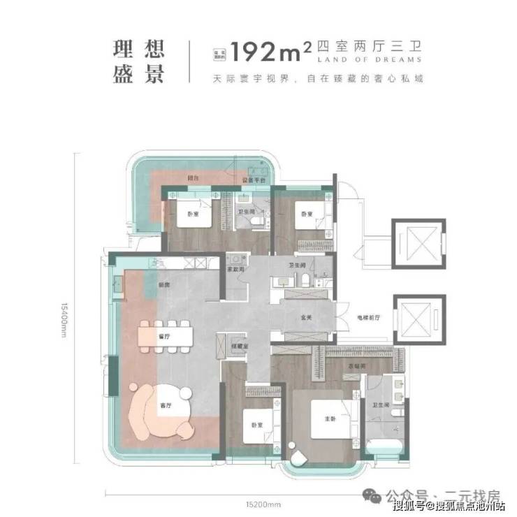 2号楼42层,2个单元,2梯2户,西边为1单元,东边为2单元,户型从西至东分别是192㎡、169㎡、169㎡,167㎡。