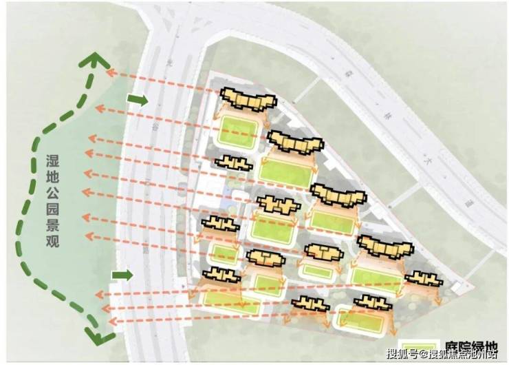 设计充分利用景观优势,采取独栋板楼“顺列错排”布局,形成向城市开放的视线通廊。在楼栋布局严格遵循南北朝向的前提下,确保所有楼栋可尽享西侧湿地公园的景观,楼栋间的景观组团将住区景观空间与城市生态空间有机融合,实现在地化的共生共享。总平面通过错落有致的布局设计,有效避免了住宅小区常见的视野遮挡问题,在确保开发强度的同时,楼栋间获得了最大化的视觉开阔度。设计通过风、光模拟使住区获得极佳的自然日照和空气流通条件,住宅空间的通风和采光效果得以优化。在最大程度上提升了基地空间的利用效率,营造宜居的生活环境。