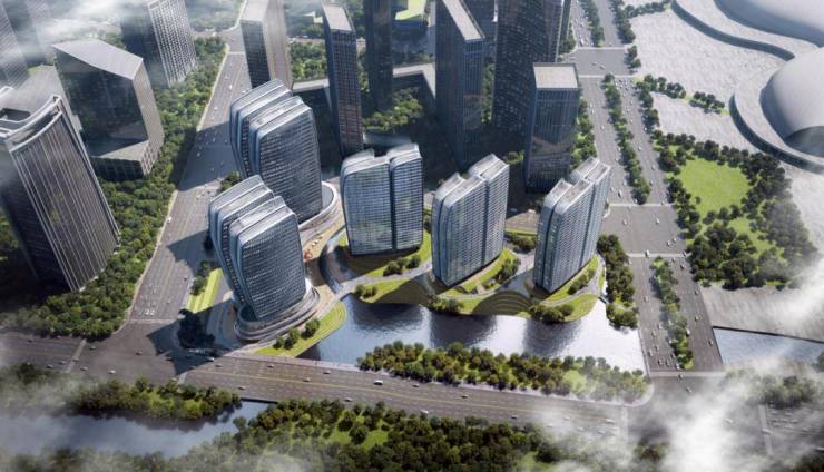 项目占地4.4万方,总建筑面积约33万方,其中地上建筑面积22万方,项目地上最高28层,地下3层,共规划5幢塔楼,由写字楼、大平层公馆和商业三大业态组成。
