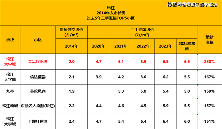 2014年入市新房中,松江新城涨幅靠前的是誉品谷水湾,当年该项目新房成交价在2万左右,现在挂牌均价高达约6.6万/㎡,约237%。