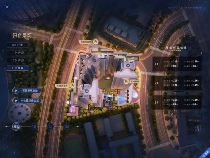 建面约89~126㎡三房至四房,注入客餐厨一体化、超大面宽阳台、与270°主卧落地窗等前卫设计,功能强大。