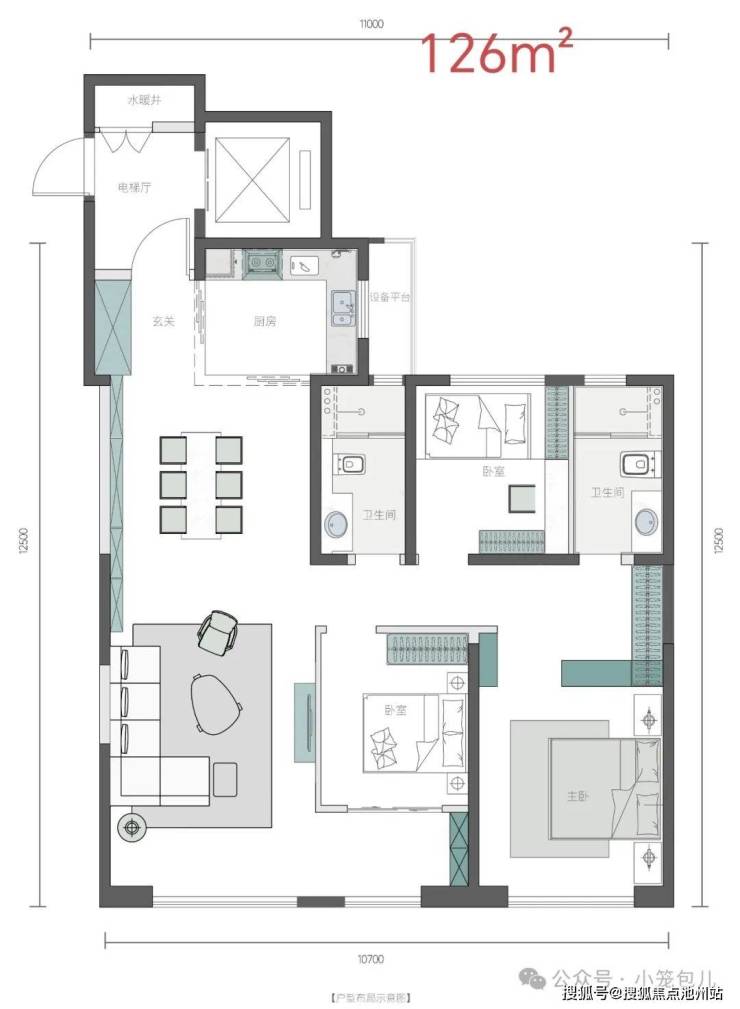 2 号楼 126m²,东边户是一梯一户,西边户一梯两户。层高 3 米总高 33 层。