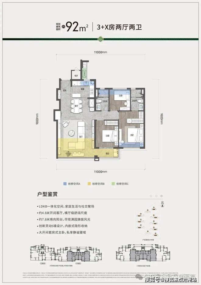 横厅与大阳台:4.8米开间大横厅,搭配7.8米南向观景阳台,玄关S型墙设计,内嵌柜体与冰箱外移设计;主卧3.2米、次卧3米面宽。
