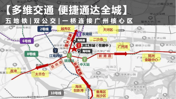 【多维路网】向北接海印大桥通达越秀天河;向东接新港西路通达琶洲金融中心,向南快速接驳南洲、番禺、南沙
