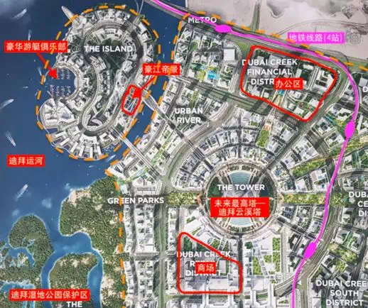 从图片上可以看到迪拜云溪港(Dubai Creek Harbour)社区规划情况。分为两个部分,以云溪塔为中心搭建的主城区和“港岛区”,分别被橘黄色的虚线所标注出来。一部分位于迪拜运河中,属于“港岛区”,另外一个部分则是陆地,“主城区”。港岛区四面环水,环境优美,能同时看到哈利法塔和云溪塔,可以分别观赏到不同的景色。待将来社区全部完成后,在社区内可以享受全方位的生活、工作、娱乐的人生新模式。这片区域的钱景感受好比是现在上海的浦东,后起之秀,潜力无穷,只得拥有。